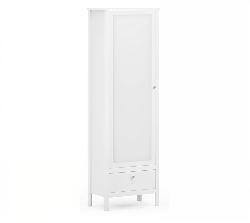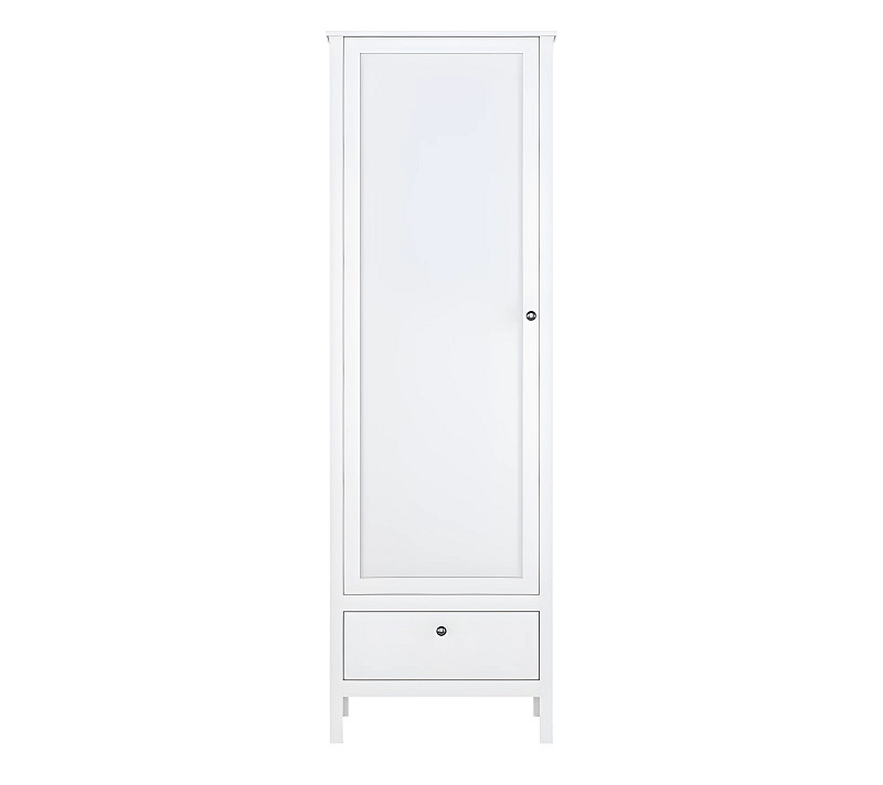Шкаф REG1D1S/200 белый состоит от отделения с тремя полками из ЛДСП за глухим распашным фасадом (дверца) и выдвижного ящика.