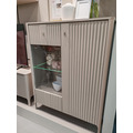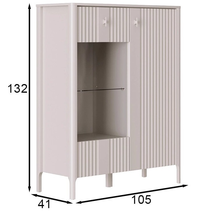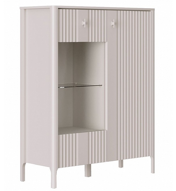 - В левой части - отделение со стеклянной полкой 5 мм и двумя полками ЛДСП за распашным рифленым фасадом со стеклянной вставкой из закаленного стекла 4 мм;