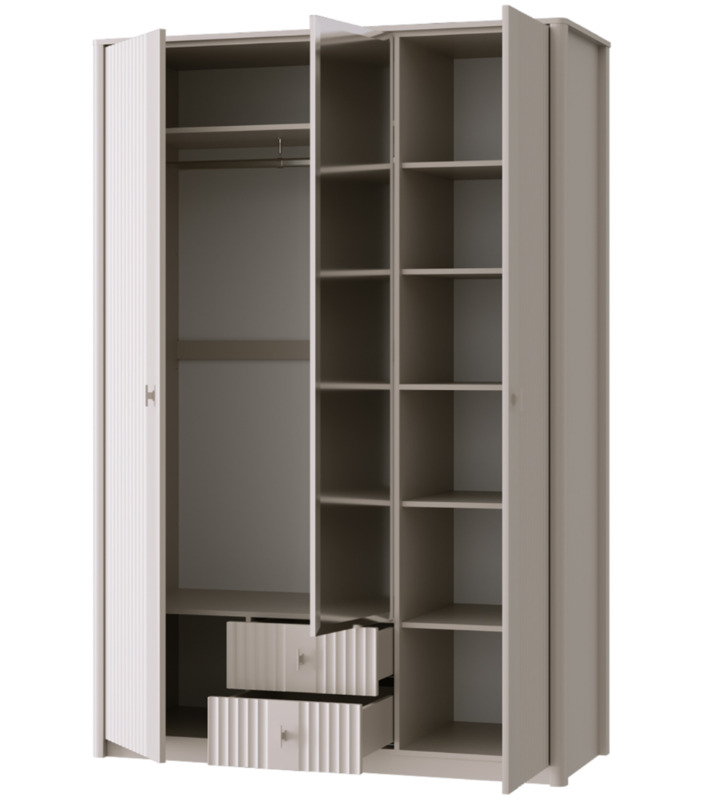 - В левой части шкафа Далия SZF3D2S - металлическая штанга для одежды, две полки ЛДСП для хранения за распашным фасадом с рифленой фактурой ЛМДФ;
