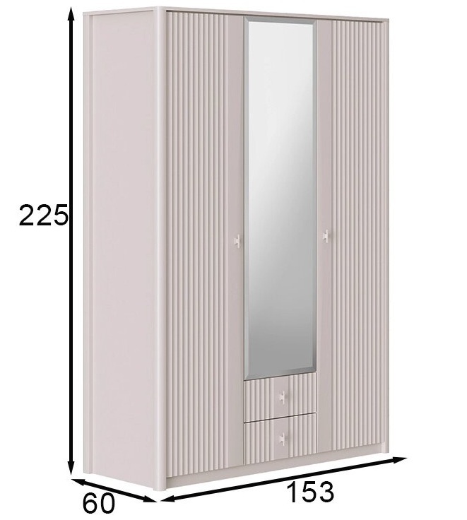 - В центральной части - пять полок ЛДСП за распашным фасадом ЛМДФ с зеркальной вставкой (зеркальная кромка с фацетом), ниже - два выдвижных ящика шариковые направляющие скрытого монтажа частичного выдвижения плавного закрывания с рифлеными фасадами;