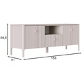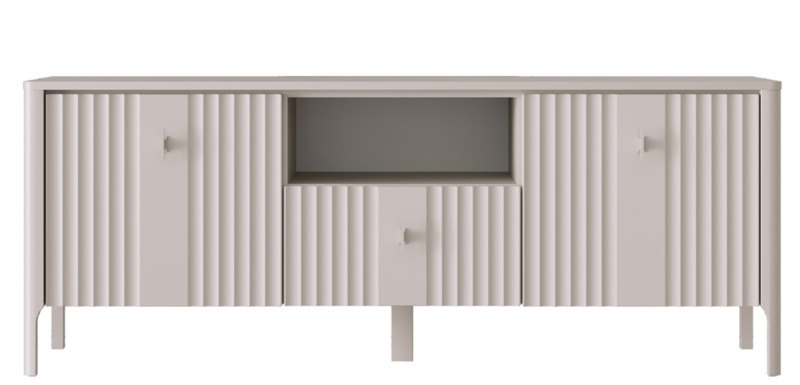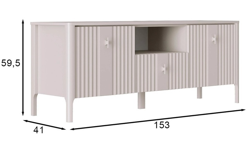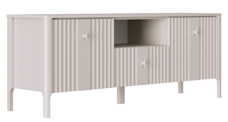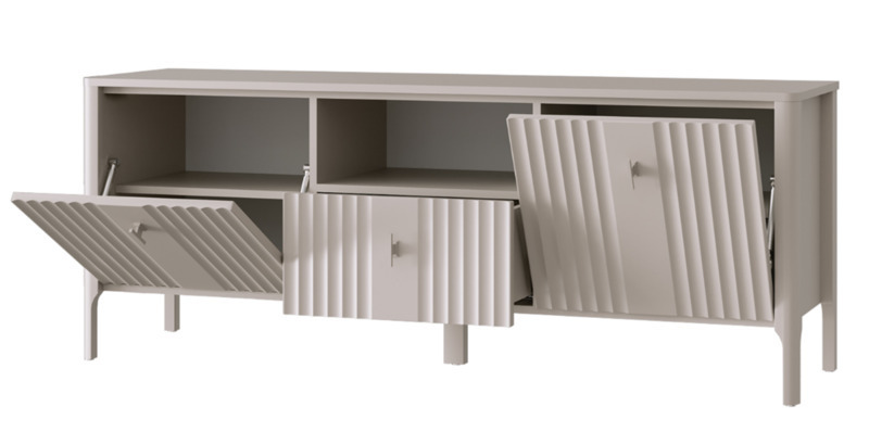 - В правой и левой частях тумбы Dalia RTV1S2K расположены отделения с полками ЛДСП за глухими откидными фасадами с рифленой фактурой ЛМДФ;