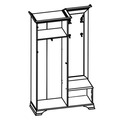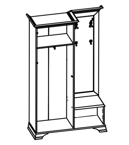 - справа находится отделение с полкой (ЛДСП) за откидной дверью и вертикальный щит с металлическими крючками для навешивания верхней одежды;